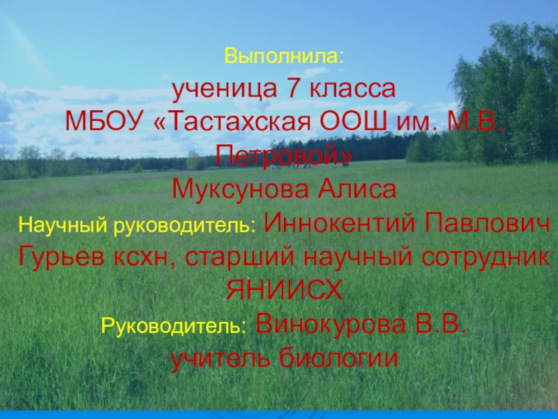 Выполнила: ученица 7 класса МБОУ «Тастахская ООШ им. М.В. Петровой» Муксунова Алиса Научный руководитель: Иннокентий Павлович Гурьев ксхн, старший научный сотрудник ЯНИИСХ Руководитель: Винокурова В.В. учитель биологии