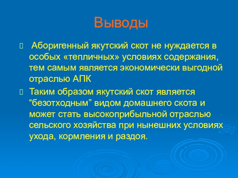 Выводы Аборигенный якутский скот не нуждается в особых «тепличных» условиях содержания, тем самым является экономически выгодной отраслью