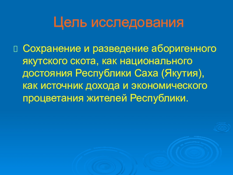 Цель исследованияСохранение и разведение аборигенного якутского скота, как национального достояния Республики Саха (Якутия), как источник дохода и