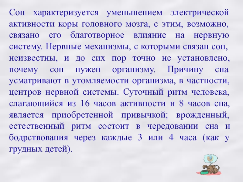 Физиологическая природа сна – в стволе мозга имеются группы нейронов, с которыми связаны бодрствование, сон, заторможенность движений во время сна.