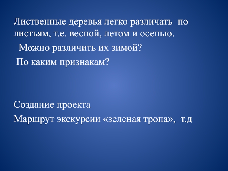Слайд 27Лиственные деревья легко различать по листьям, т.е. весной, летом и осенью.
