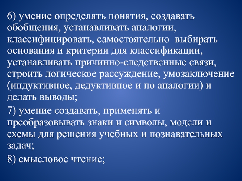 Слайд 66) умение определять понятия, создавать обобщения, устанавливать аналогии, классифицировать, самостоятельно выбирать