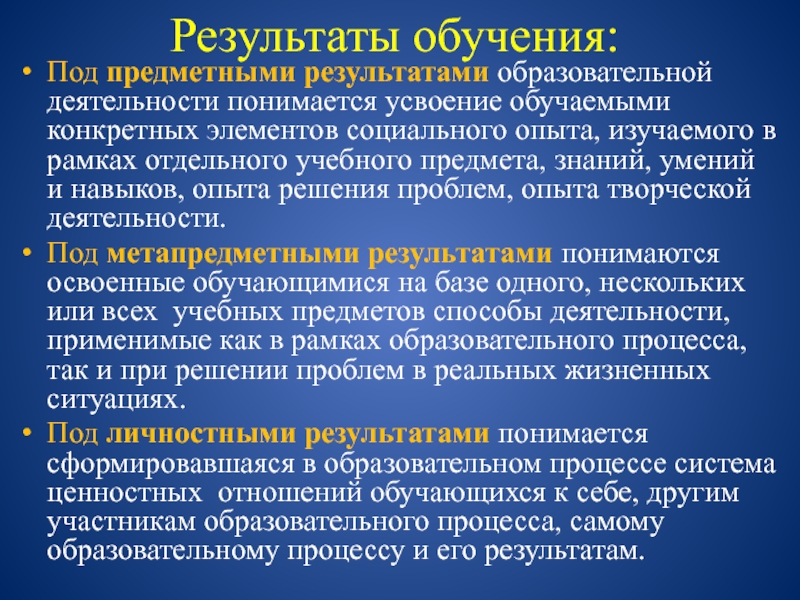 Под предметными результатами образовательной деятельности понимается усвоение обучаемыми конкретных элементов