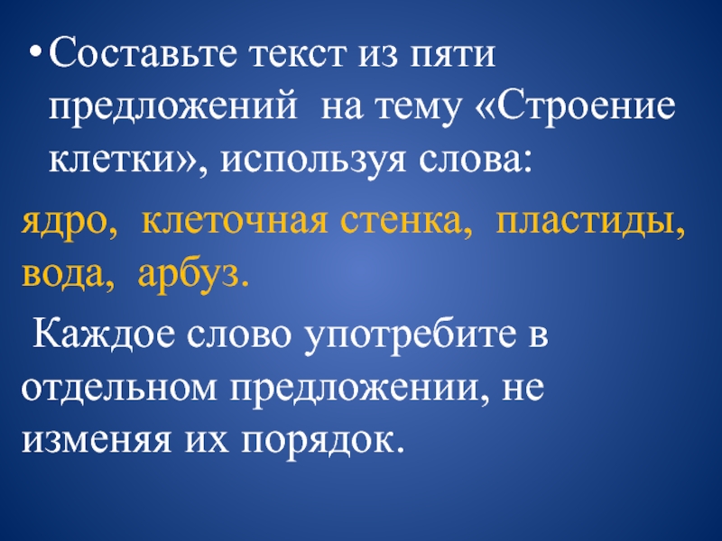 Слайд 17Составьте текст из пяти предложений на тему «Строение клетки», используя слова: