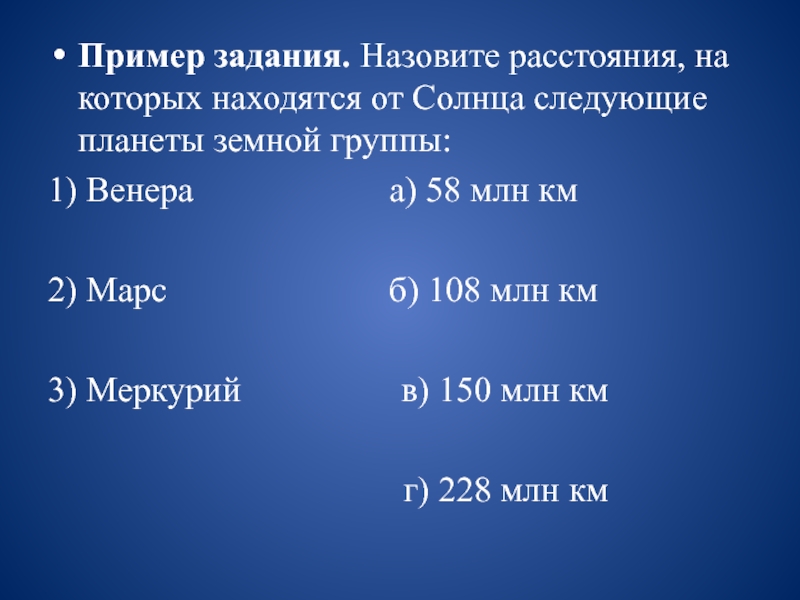 Слайд 10Пример задания. Назовите расстояния, на которых находятся от Солнца следующие планеты