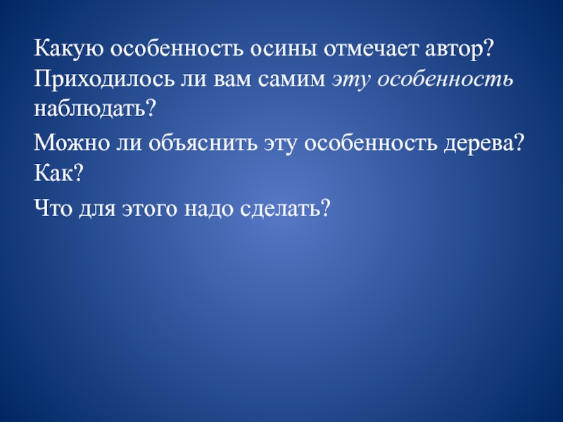 Слайд 26Какую особенность осины отмечает автор? Приходилось ли вам самим эту особенность