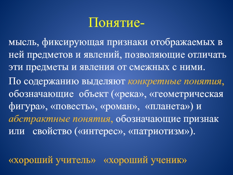 По содержанию выделяют конкретные понятия, обозначающие объект («река», «геометрическая фигура», «повесть», «роман», «планета») и абстрактные понятия, обозначающие признак или свойство («интерес», «патриотизм»).