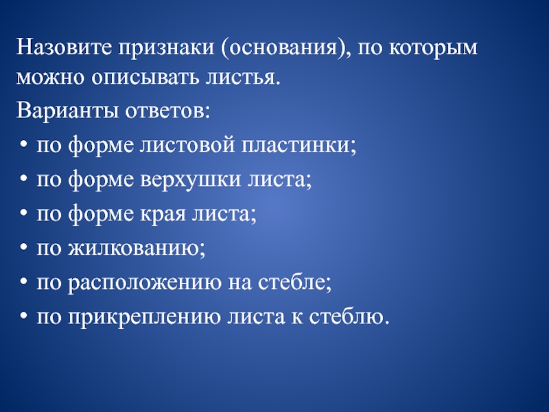 Слайд 21Назовите признаки (основания), по которым можно описывать листья.