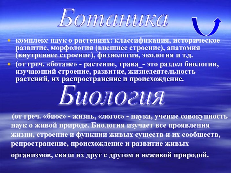 (от греч. «биос» - жизнь, «логос» - наука, учение совокупность наук о живой природе. Биология изучает все проявления жизни, строение и функции живых существ и их сообществ, рспространение, происхождение и развитие живых организмов, связи их друг с другом и неживой природой.