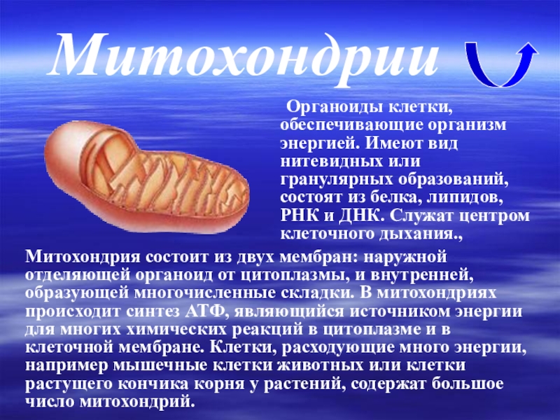 Митохондрия состоит из двух мембран: наружной отделяющей органоид от цитоплазмы, и внутренней, образующей многочисленные складки. В митохондриях происходит синтез АТФ, являющийся источником энергии для многих химических реакций в цитоплазме и в клеточной мембране. Клетки, расходующие много энергии, например мышечные клетки животных или клетки растущего кончика корня у растений, содержат большое число митохондрий.