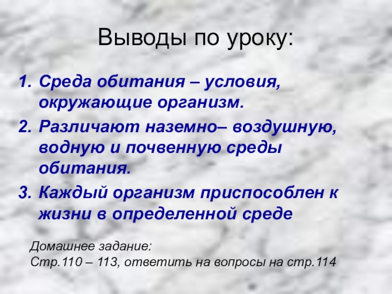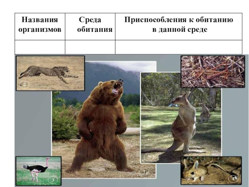 Найти отличия между условиями жизни в разных средах и определить черты приспособленности организмов к жизни в них;