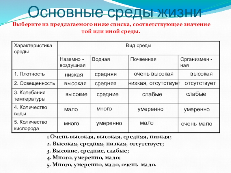 Выберите из предлагаемого ниже списка, соответствующее значение той или иной среды.