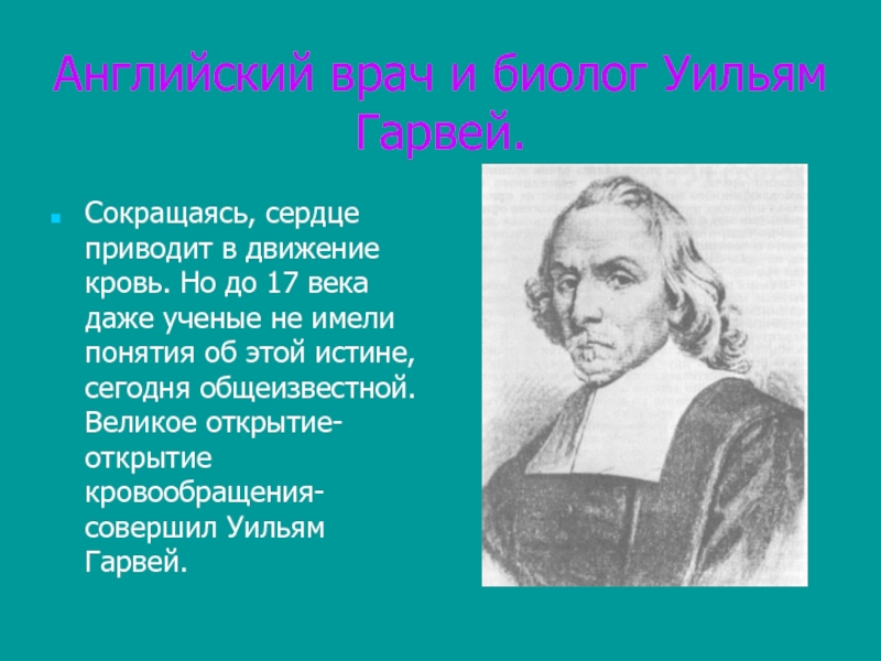 Но до 17 века даже ученые не имели понятия об этой истине, сегодня общеизвестной. Великое открытие- открытие кровообращения- совершил Уильям Гарвей.