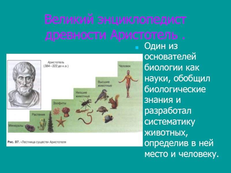 биологические знания и разработал систематику животных, определив в ней место и человеку.