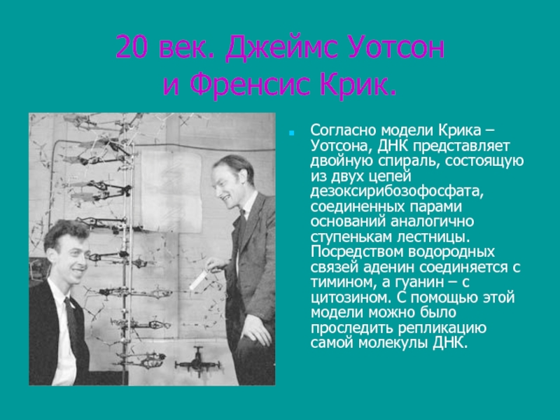ДНК представляет двойную спираль, состоящую из двух цепей дезоксирибозофосфата, соединенных парами оснований аналогично ступенькам лестницы. Посредством водородных связей аденин соединяется с тимином, а гуанин – с цитозином. С помощью этой модели можно было проследить репликацию самой молекулы ДНК.