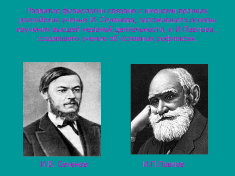 Слайд 21Развитие физиологии связано с именами великих российских ученых И. Сеченова, заложившего
