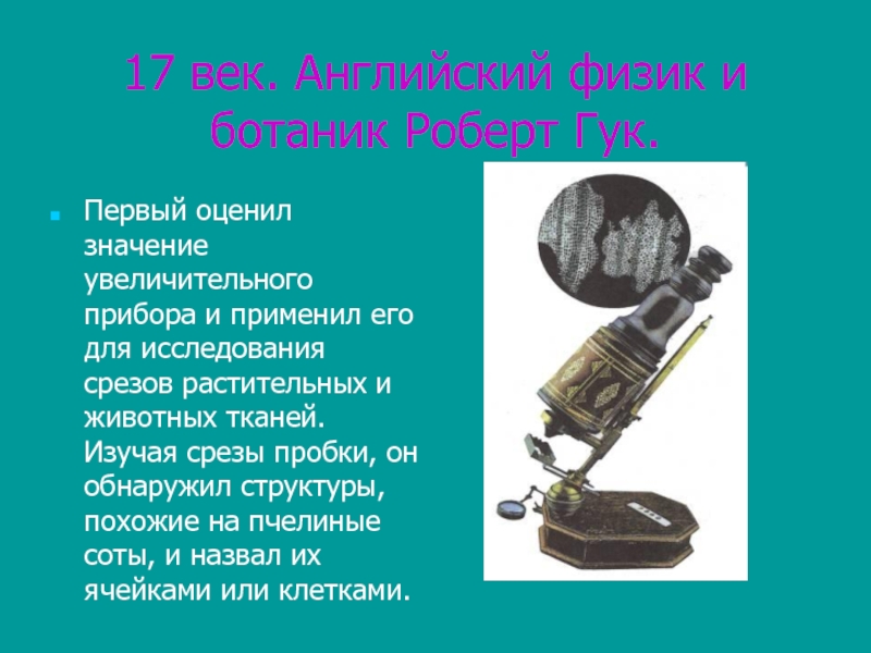 прибора и применил его для исследования срезов растительных и животных тканей. Изучая срезы пробки, он обнаружил структуры, похожие на пчелиные соты, и назвал их ячейками или клетками.