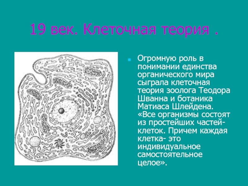 сыграла клеточная теория зоолога Теодора Шванна и ботаника Матиаса Шлейдена. «Все организмы состоят из простейших частей- клеток. Причем каждая клетка- это индивидуальное самостоятельное целое».