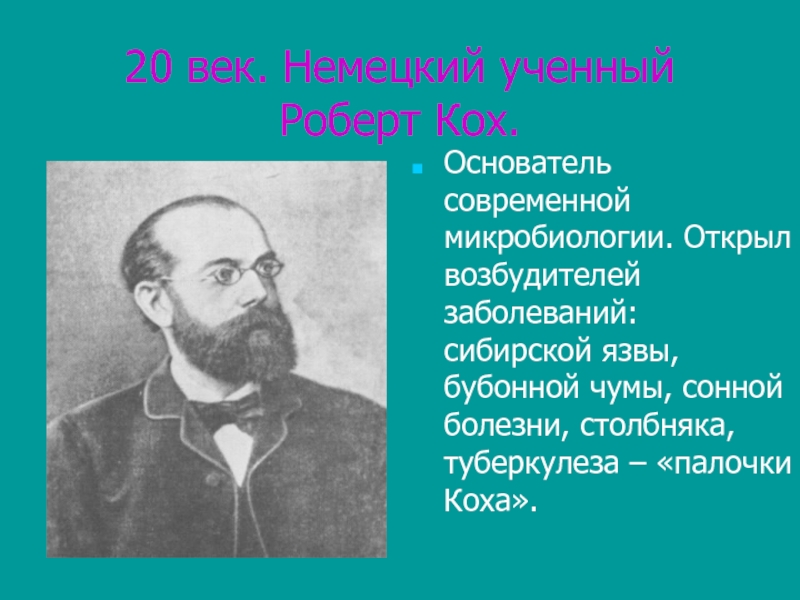 Слайд 1920 век. Немецкий ученный Роберт Кох.