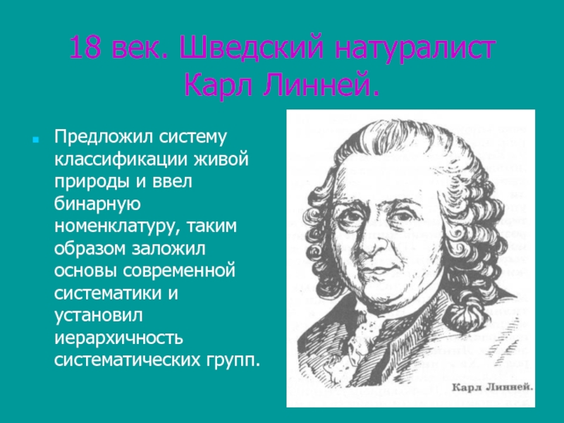 Слайд 1318 век. Шведский натуралист Карл Линней.