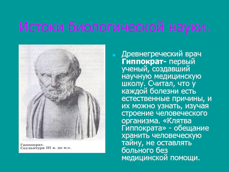 Считал, что у каждой болезни есть естественные причины, и их можно узнать, изучая строение человеческого организма. «Клятва Гиппократа» - обещание хранить человеческую тайну, не оставлять больного без медицинской помощи.