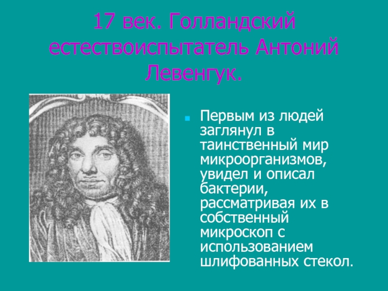 Слайд 1217 век. Голландский естествоиспытатель Антоний Левенгук.