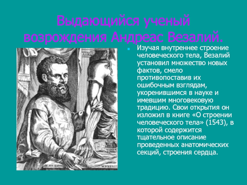 множество новых фактов, смело противопоставив их ошибочным взглядам, укоренившимся в науке и имевшим многовековую традицию. Свои открытия он изложил в книге «О строении человеческого тела» (1543), в которой содержится тщательное описание проведенных анатомических секций, строения сердца.