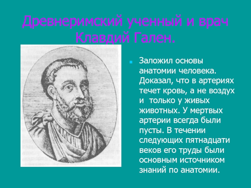 Слайд 7Древнеримский ученный и врач Клавдий Гален.
