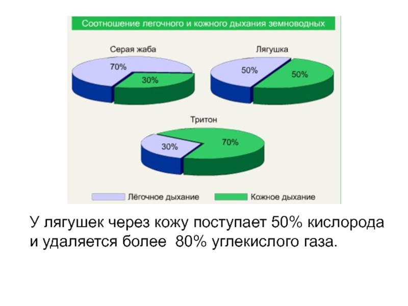 Слайд 25У лягушек через кожу поступает 50% кислорода и удаляется более 80%