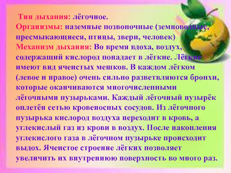 дыхания: Во время вдоха, воздух, содержащий кислород попадает в лёгкие. Лёгкие имеют вид ячеистых мешков. В каждом лёгком (левое и правое) очень сильно разветвляются бронхи, которые оканчиваются многочисленными лёгочными пузырьками. Каждый лёгочный пузырёк оплетён сетью кровеносных сосудов. Из лёгочного пузырька кислород воздуха переходит в кровь, а углекислый газ из крови в воздух. После накопления углекислого газа в лёгочном пузырьке происходит выдох. Ячеистое строение лёгких позволяет увеличить их внутреннюю поверхность во много раз.