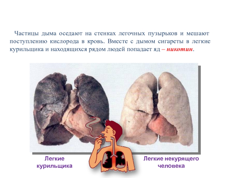 пузырьков и мешают поступлению кислорода в кровь. Вместе с дымом сигареты в легкие курильщика и находящихся рядом людей попадает яд – никотин.