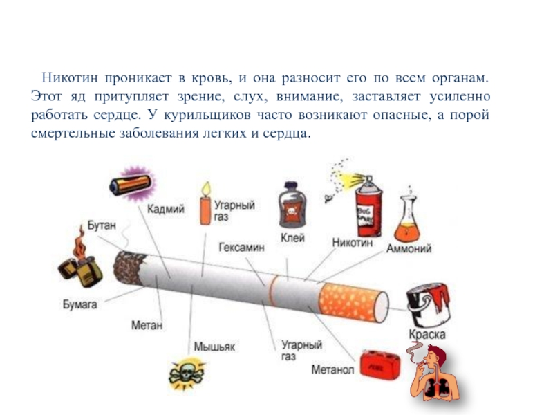 разносит его по всем органам. Этот яд притупляет зрение, слух, внимание, заставляет усиленно работать сердце. У курильщиков часто возникают опасные, а порой смертельные заболевания легких и сердца.