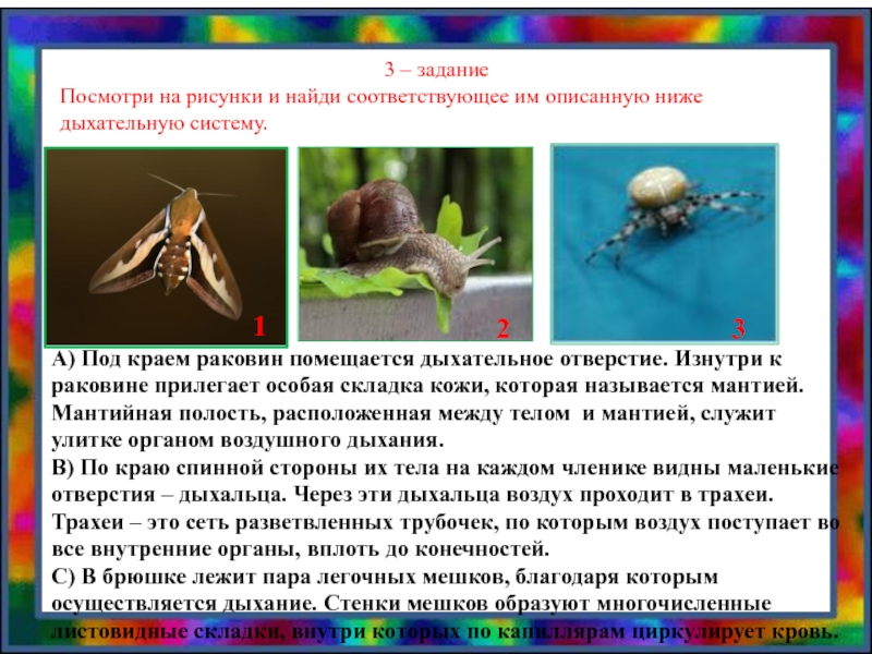А) Под краем раковин помещается дыхательное отверстие. Изнутри к раковине прилегает особая складка кожи, которая называется мантией. Мантийная полость, расположенная между телом и мантией, служит улитке органом воздушного дыхания.