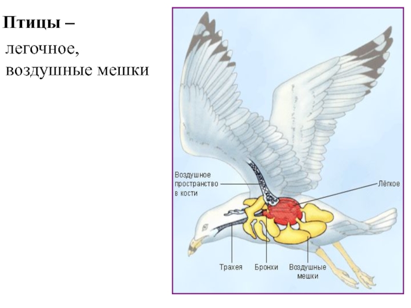 Легкие – ячеистые мешки, пронизанные множеством кровеносных