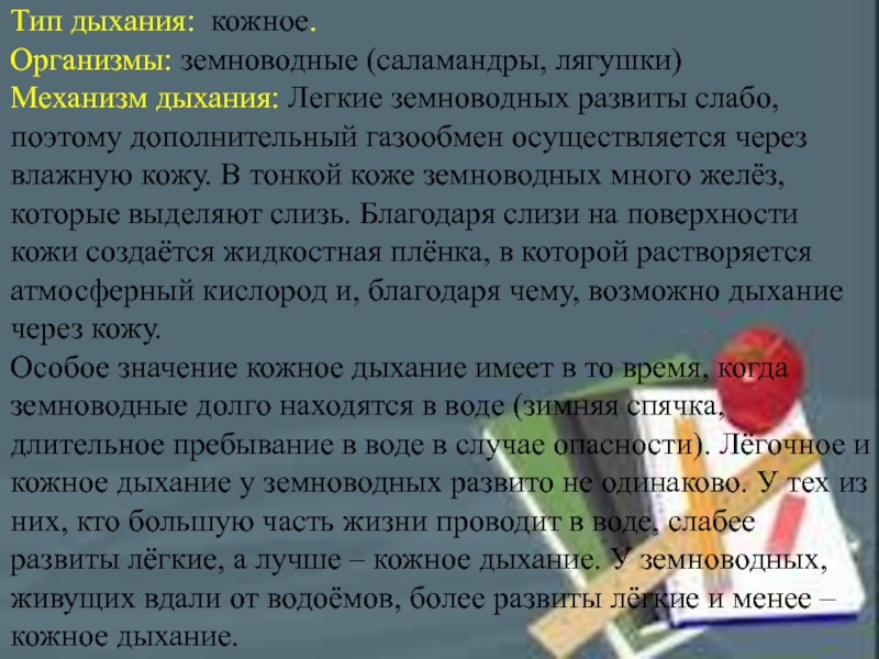поэтому дополнительный газообмен осуществляется через влажную кожу. В тонкой коже земноводных много желёз, которые выделяют слизь. Благодаря слизи на поверхности кожи создаётся жидкостная плёнка, в которой растворяется атмосферный кислород и, благодаря чему, возможно дыхание через кожу.