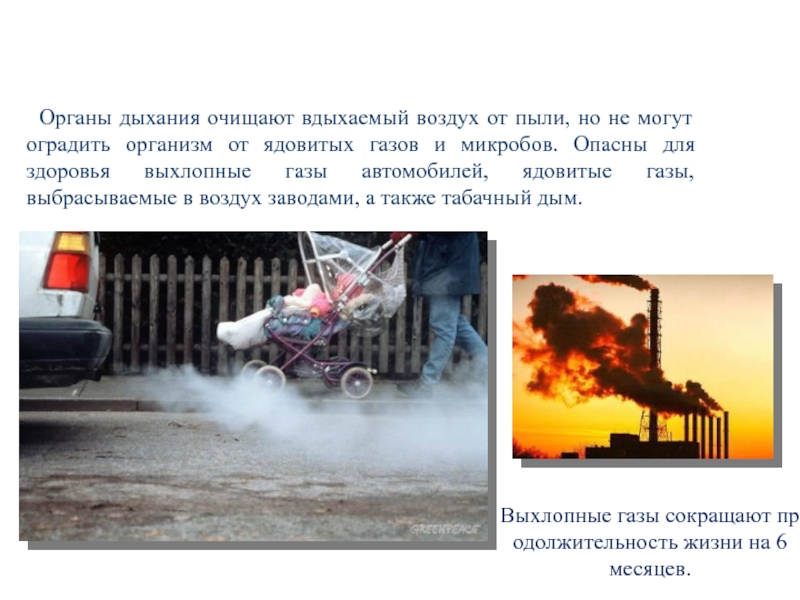 пыли, но не могут оградить организм от ядовитых газов и микробов. Опасны для здоровья выхлопные газы автомобилей, ядовитые газы, выбрасываемые в воздух заводами, а также табачный дым.