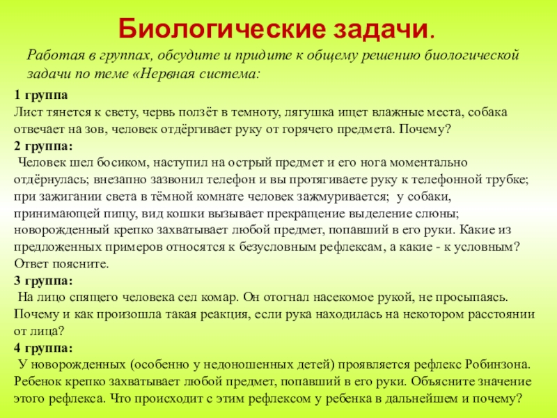 Работая в группах, обсудите и придите к общему решению биологической задачи по теме «Нервная система: