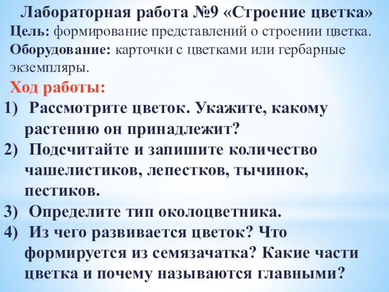 Лабораторная работа №9 «Строение цветка»Цель: формирование представлений о строении цветка.Оборудование: карточки с цветками или гербарные экземпляры.Ход работы: