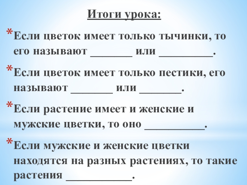 Итоги урока:Если цветок имеет только тычинки, то его называют _______ или _________.Если цветок имеет только пестики, его