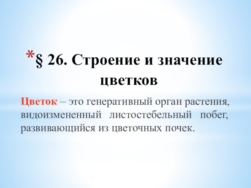 § 26. Строение и значение цветковЦветок – это генеративный орган растения, видоизмененный листостебельный побег, развивающийся из цветочных