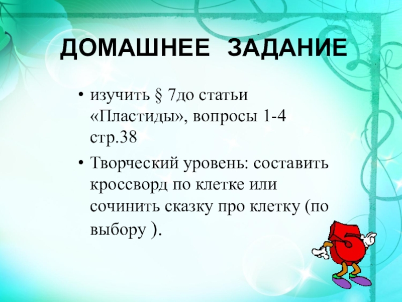 ДОМАШНЕЕ  ЗАДАНИЕизучить § 7до статьи «Пластиды», вопросы 1-4 стр.38Творческий уровень: составить кроссворд по клетке или сочинить сказку