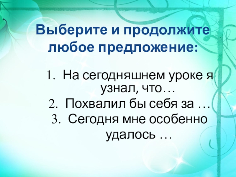 Выберите и продолжите любое предложение:На сегодняшнем уроке я узнал, что…Похвалил бы себя за …Сегодня мне особенно