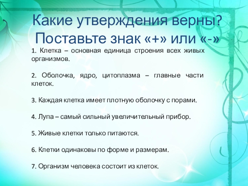 Какие утверждения верны?Поставьте знак «+» или «-»1. Клетка – основная единица строения всех живых организмов. 2. Оболочка, ядро,