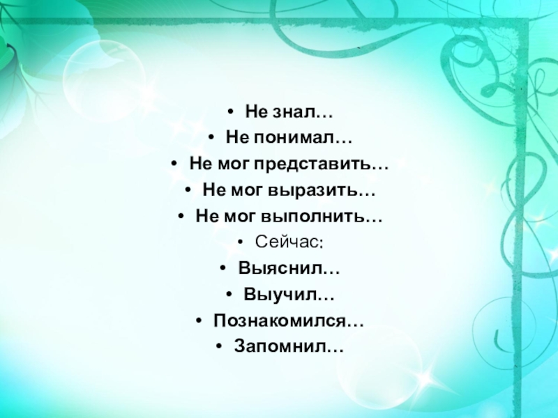 Не знал…Не понимал…Не мог представить…Не мог выразить…Не мог выполнить…Сейчас:Выяснил…Выучил…Познакомился…Запомнил…