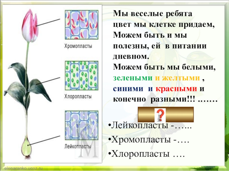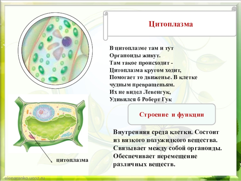 Ядро состоит из двух мембран, имеет поры и ядрышко. Отвечает за наследственную информацию клетки.