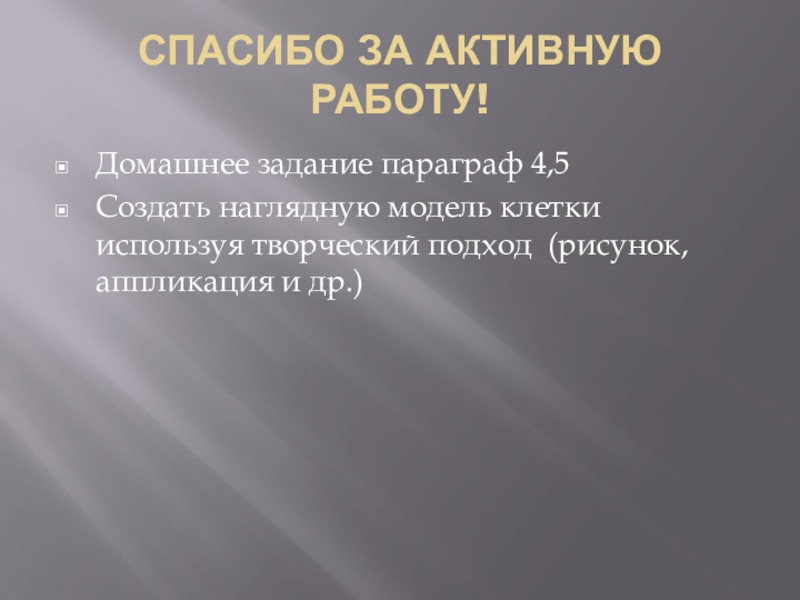 СПАСИБО ЗА АКТИВНУЮ РАБОТУ!Домашнее задание параграф 4,5Создать наглядную модель клетки используя творческий подход (рисунок, аппликация и др.)