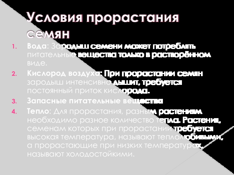 Вода: Зародыш семени может потреблять питательные вещества только в растворённом виде.Кислород воздуха: При прорастании семян зародыш интенсивно