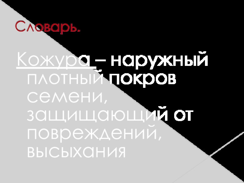 Слайд 9Кожура – наружный плотный покров семени, защищающий от повреждений, высыхания