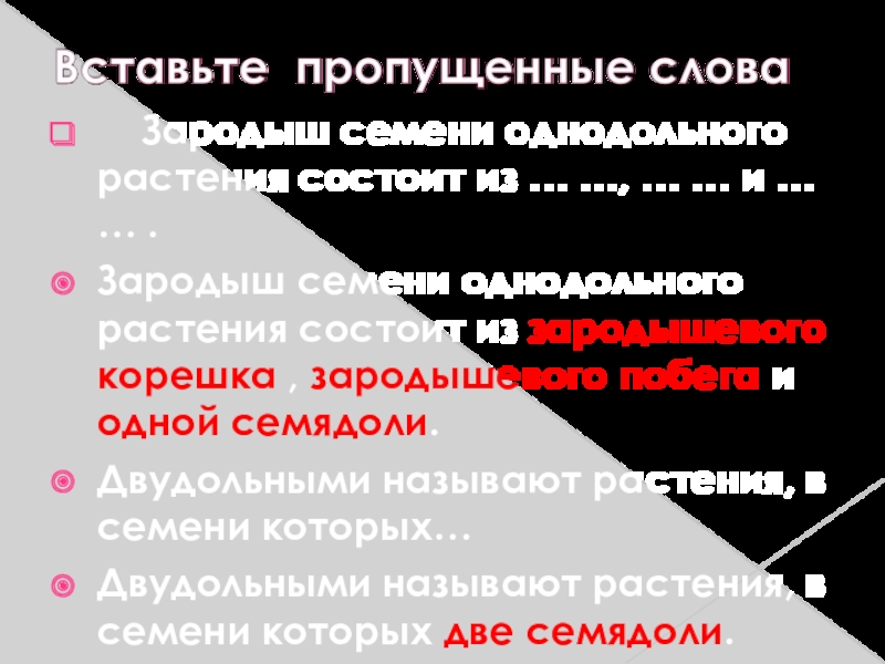Слайд 32 Зародыш семени однодольного растения состоит из … …, …