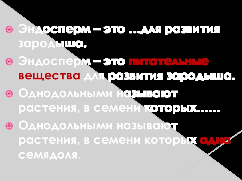 Эндосперм – это …для развития зародыша.Эндосперм – это питательные вещества для развития зародыша.Однодольными называют растения, в семени